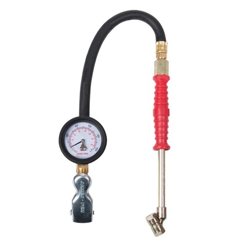 Dial Gauge Inflator 50 mm Hold On chuck features pressed steel operating lever and rubber impact protector on gauge.Ideal for tyre fitters with one button operation and pubber grip on chuck. Pressure range 0-1000 Kpa (0-150 PSI).