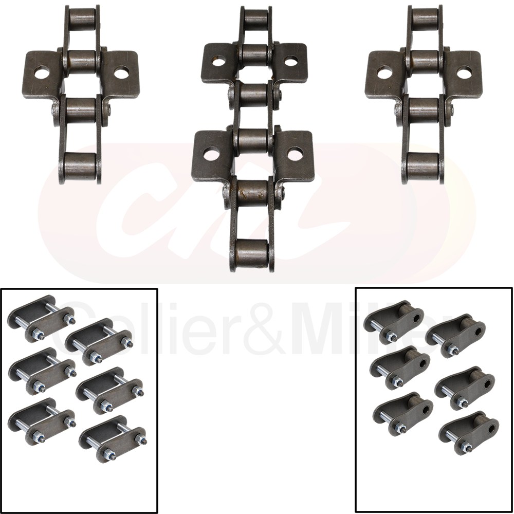 C&M feeder house repair service kit compatible with 3 chain John Deere® late serial 60 and 70 series and S6 series combine harvesters. This service kit is supplied to assist repair of feeder chains, all components are chrome pin with solid bushings.
