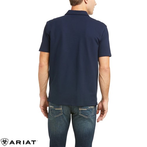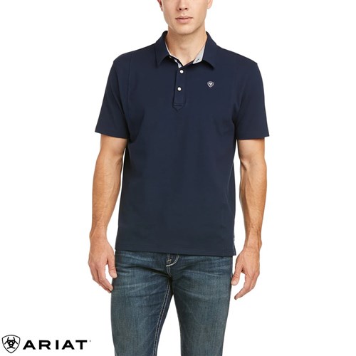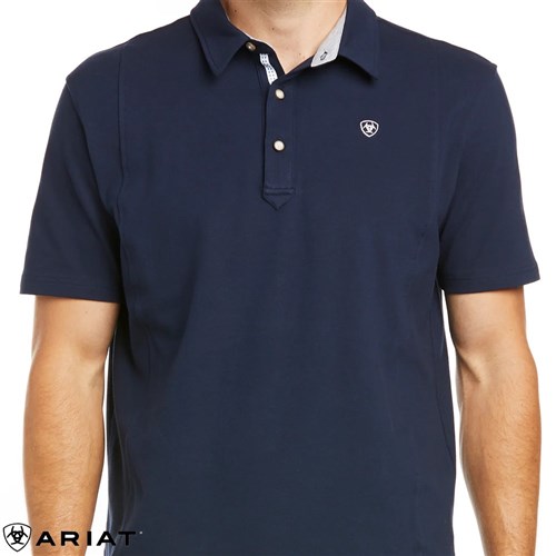 Elevate your wardrobe with the Ariat Men's Medal Polo in Navy—a perfect blend of comfort, performance, and style. Crafted from a soft, flexible cotton stretch fabric, this polo offers unbeatable moisture-wicking capabilities to keep you dry and odor-free throughout your day. Featuring advanced Moisture Movement Technology™ to pull moisture away from your skin, it ensures a fresh feeling no matter the intensity of your ride. The classic design is enhanced with polished grosgrain detailing on the inner button placket and collar, adding a refined touch to your look.