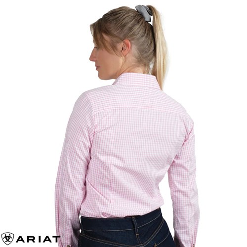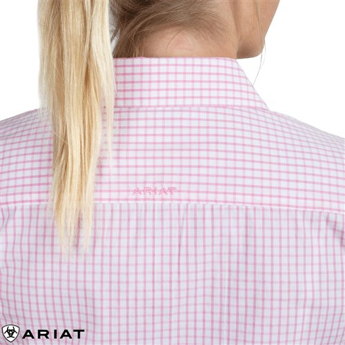 The Ariat Women’s Kirby Shirt in Pink Check is the perfect combination of style, comfort, and functionality. With an updated fit that provides even more room to move, this best-seller is wear-tested and rider-approved, ensuring a flattering look for everyone. Featuring Greater Arm Mobility™ for unrestricted movement, a taped placket and back neck seam for durability, and a single chest pocket for added convenience, this shirt has it all. Made from a stretch cotton poplin blend, it moves with your body and is wrinkle-resistant, keeping you looking sharp all day.