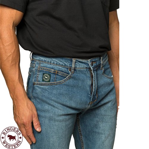 Tough, reliable, and built for real work—the Muster Men's Slim Straight Fit Jeans by Ringers Western are engineered to handle the harshest conditions while keeping you comfortable and looking sharp. Whether you're in the saddle, on the job, or heading into town, these jeans deliver on every front. Made from 13.5oz durable denim with a 99% cotton / 1% elastane blend, they offer just enough stretch for flexibility without compromising on strength. The mid-rise fit rests comfortably around the waist, while the slim fit through the hip and seat flows into a stackable straight leg, giving you a classic look with modern comfort. Designed with practicality in mind, the Muster features a metal zipper fly, standard 2" belt loops for your favourite leather belt, and the signature Ringers Western 'Muster' embroidery on the back pocket. Finished with branded hardware, Ringers Western labels, and a traditional five-pocket layout, these jeans are as functional as they are stylish.