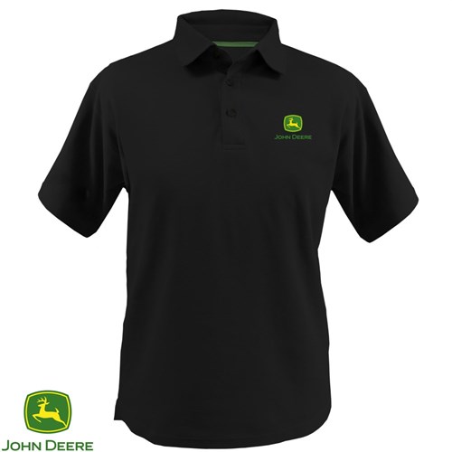 The new John Deere Men's Black Polo Tee shirt is 100% synthetic for improved breathability and comfort.