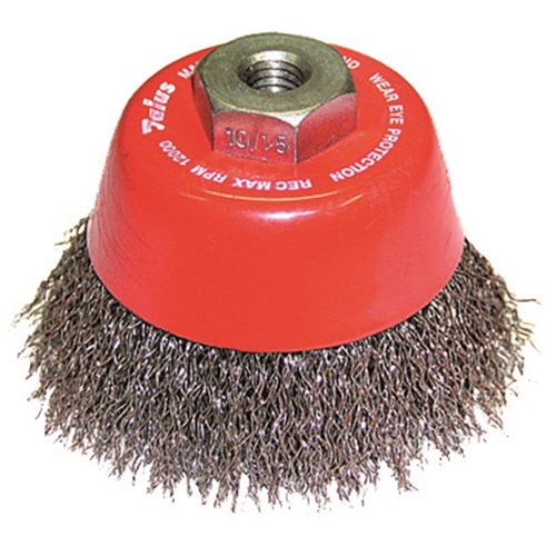 This M14, 75mm crimped wire brush (cup shape) is supplied with bushing to suit any angle grinder from 4"-5" (100mm-125mm). The wire strands are twisted together allowing more force to be applied to the tool while also achieving longer tool life. Ideal for the removal of surface rust or burrs.