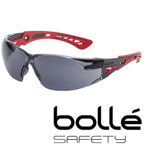 Bolle 'Rush Plus' Ultra light-weight unisex medium / larger safety spectacle. With and adjustable PVC nose bridgeand anti-fog / anti-scratch smoke lens this is the ideal safety spectacle with a modernstyle.