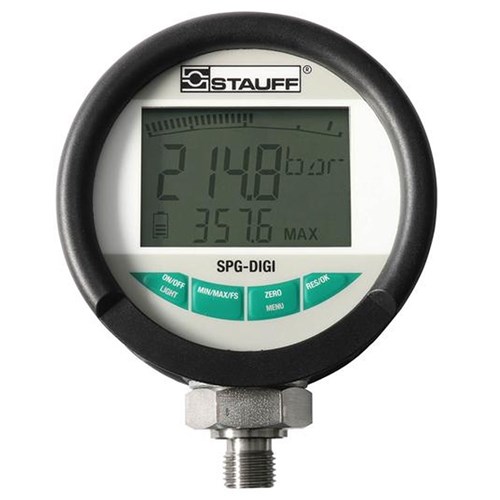 C&M stock a range of Stauff SPG-DIGI digital pressure gauges are designed for digital measurement and display of pressure in hydraulic systems, especially for oils, lubricants and water. Current measured values as well as min and max values can be displayed with a precision of 0.5% of the full scale value.