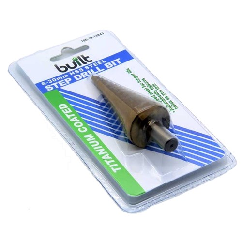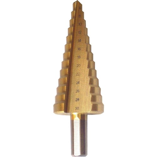 Built Step Drill, 6mm-30mm High Speed Steel Bit. This titanium coated bit automatically deburrs holes as you drill.
