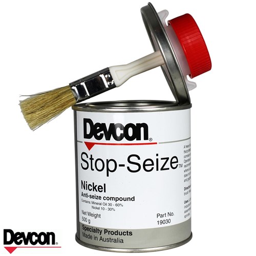 Devcon Stop Seize - Nickle. Stop Seize Nickel is aheavy duty, high temperature water repelling compound that protects against seizure of metal parts. This product resists corrosion and galling and reduces friction and wear in heavy pressure applications.>/H4> It is recommended for use withstainless steel and other alloys where a copper based anti-seize compound is unsuitable. It has outstanding anti-seize properties in conditions up to 1400 Degree Celsius and is suitable for ease of assembly and dismantling of metal components. Specifically designed to withstand highly caustic and corrosive conditions. The solid constituents are chemically inert to concentrated acid and alkaline attack, thus providing maximum protection in this environment. Recommended Applications include Lubricating and protecting stainless steel fasteners, industrial fasteners and other threaded components, valve assemblies, bushings, flanges, slides, guide pins and spindles.