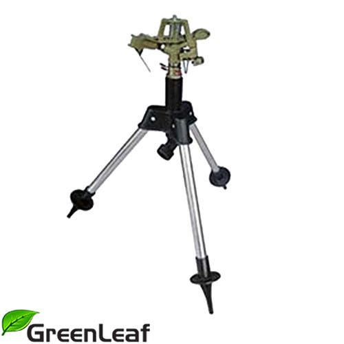 GreenLeaf Impulse Tripod Sprinkler. Features metal folding legs, distance control, adjustable spray pattern and spiked feet. Throws water up to 15 meters. This rust resistant tripod sprinkler suits snap on hose fittings.