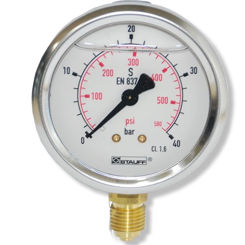 C&M stock a range of glycerine filled Stauff diagnostic pressure gauges suitable for oil-hydraulic and gaseous media which do not corrode copper alloys. Supplied in european standard dual scale (Bar/Psi) with a stainless steel housing, acrylic clear face and process connection for BSP (G1/4 for 63mm and G1/2 for 100mm).