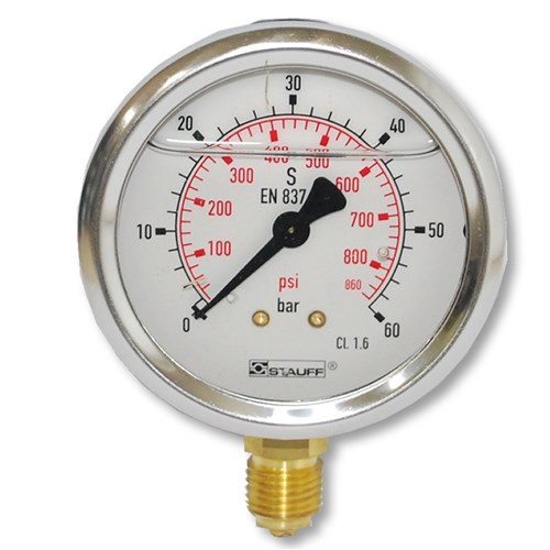 C&M stock a range of glycerine filled Stauff diagnostic pressure gauges suitable for oil-hydraulic and gaseous media which do not corrode copper alloys. Supplied in european standard dual scale (Bar/Psi) with a stainless steel housing, acrylic clear face and process connection for BSP (G1/4 for 63mm and G1/2 for 100mm).