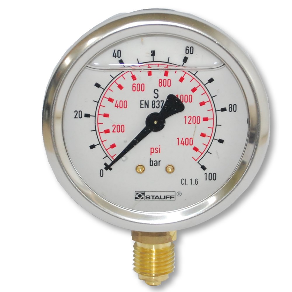 C&M stock a range of glycerine filled Stauff diagnostic pressure gauges suitable for oil-hydraulic and gaseous media which do not corrode copper alloys. Supplied in european standard dual scale (Bar/Psi) with a stainless steel housing, acrylic clear face and process connection for BSP (G1/4 for 63mm and G1/2 for 100mm).
