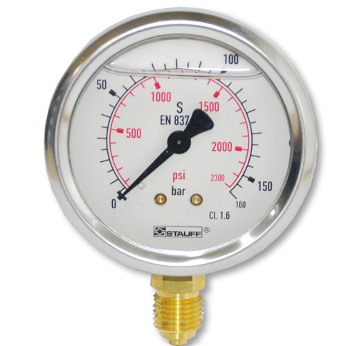C&M stock a range of glycerine filled Stauff diagnostic pressure gauges suitable for oil-hydraulic and gaseous media which do not corrode copper alloys. Supplied in european standard dual scale (Bar/Psi) with a stainless steel housing, acrylic clear face and process connection for BSP (G1/4 for 63mm and G1/2 for 100mm).