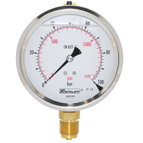 C&M stock a range of glycerine filled Stauff diagnostic pressure gauges suitable for oil-hydraulic and gaseous media which do not corrode copper alloys. Supplied in european standard dual scale (Bar/Psi) with a stainless steel housing, acrylic clear face and process connection for BSP (G1/4 for 63mm and G1/2 for 100mm).