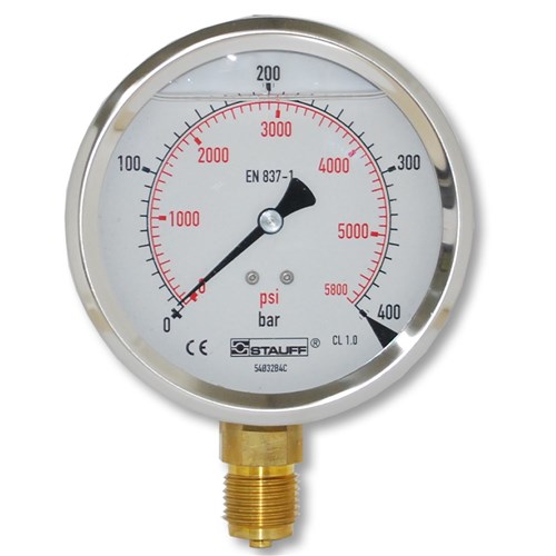 C&M stock a range of glycerine filled Stauff diagnostic pressure gauges suitable for oil-hydraulic and gaseous media which do not corrode copper alloys. Supplied in european standard dual scale (Bar/Psi) with a stainless steel housing, acrylic clear face and process connection for BSP (G1/4 for 63mm and G1/2 for 100mm).