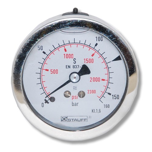 C&M stock a range of glycerine filled Stauff diagnostic pressure gauges suitable for oil-hydraulic and gaseous media which do not corrode copper alloys. Supplied in european standard dual scale (Bar/Psi) with a stainless steel housing, acrylic clear face and process connection for BSP (G1/4 for 63mm and G1/2 for 100mm).