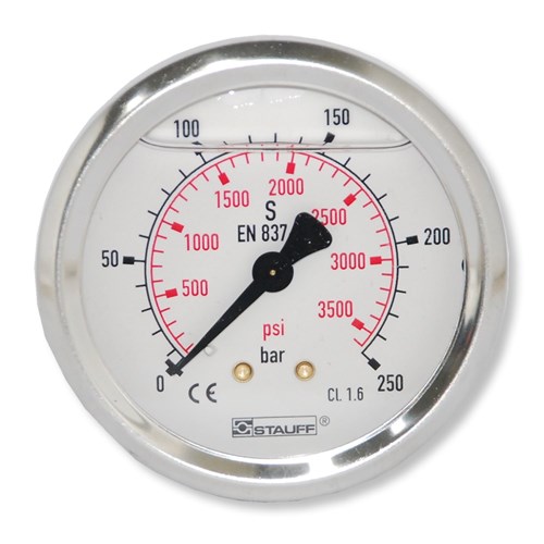 C&M stock a range of glycerine filled Stauff diagnostic pressure gauges suitable for oil-hydraulic and gaseous media which do not corrode copper alloys. Supplied in european standard dual scale (Bar/Psi) with a stainless steel housing, acrylic clear face and process connection for BSP (G1/4 for 63mm and G1/2 for 100mm).