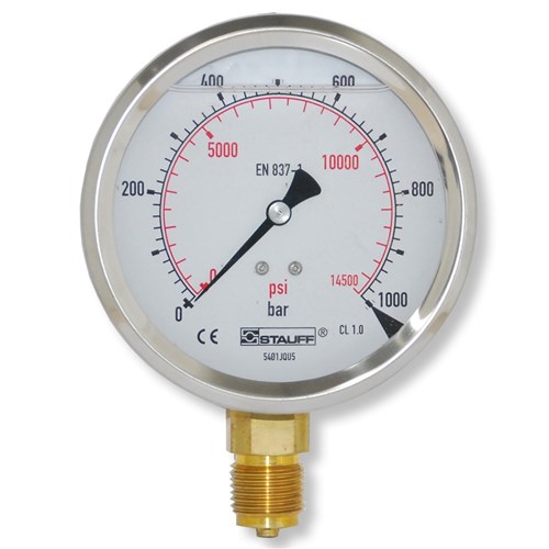 C&M stock a range of glycerine filled Stauff diagnostic pressure gauges suitable for oil-hydraulic and gaseous media which do not corrode copper alloys. Supplied in european standard dual scale (Bar/Psi) with a stainless steel housing, acrylic clear face and process connection for BSP (G1/4 for 63mm and G1/2 for 100mm).