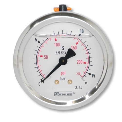 C&M stock a range of glycerine filled Stauff diagnostic pressure gauges suitable for oil-hydraulic and gaseous media which do not corrode copper alloys. Supplied in european standard dual scale (Bar/Psi) with a stainless steel housing, acrylic clear face and process connection for BSP (G1/4 for 63mm and G1/2 for 100mm).