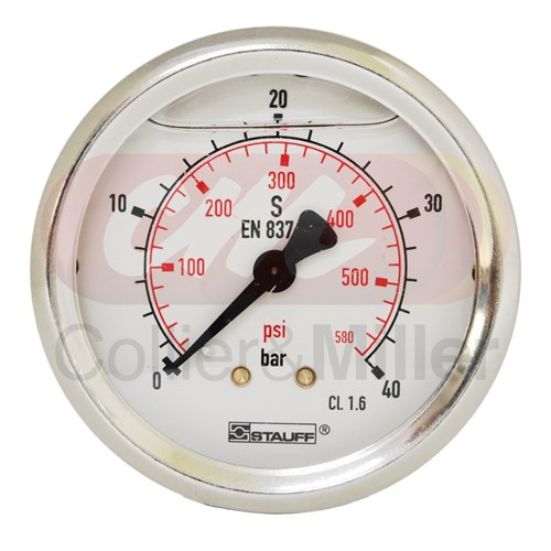 C&M stock a range of glycerine filled Stauff diagnostic pressure gauges suitable for oil-hydraulic and gaseous media which do not corrode copper alloys. Supplied in european standard dual scale (Bar/Psi) with a stainless steel housing, acrylic clear face and process connection for BSP (G1/4 for 63mm and G1/2 for 100mm).