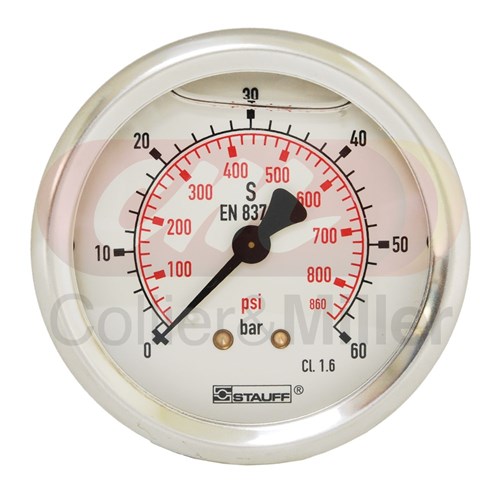 C&M stock a range of glycerine filled Stauff diagnostic pressure gauges suitable for oil-hydraulic and gaseous media which do not corrode copper alloys. Supplied in european standard dual scale (Bar/Psi) with a stainless steel housing, acrylic clear face and process connection for BSP (G1/4 for 63mm and G1/2 for 100mm).