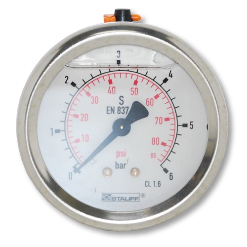 C&M stock a range of glycerine filled Stauff diagnostic pressure gauges suitable for oil-hydraulic and gaseous media which do not corrode copper alloys. Supplied in european standard dual scale (Bar/Psi) with a stainless steel housing, acrylic clear face and process connection for BSP (G1/4 for 63mm and G1/2 for 100mm).