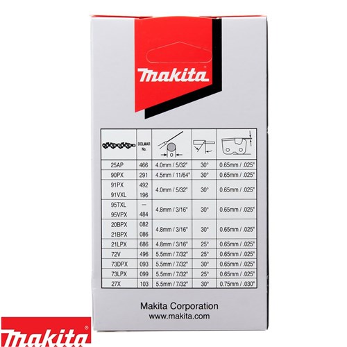 The Makita Chainsaw Chain is designed specifically for the DUN122, delivering clean, accurate cuts ideal for both general pruning and detailed carving tasks. With its micro-half chisel design and fine 1/4" pitch, this robust chain excels in precision work. Perfectly suited for a 6" (15cm) bar, it offers excellent control and performance in compact cutting applications.