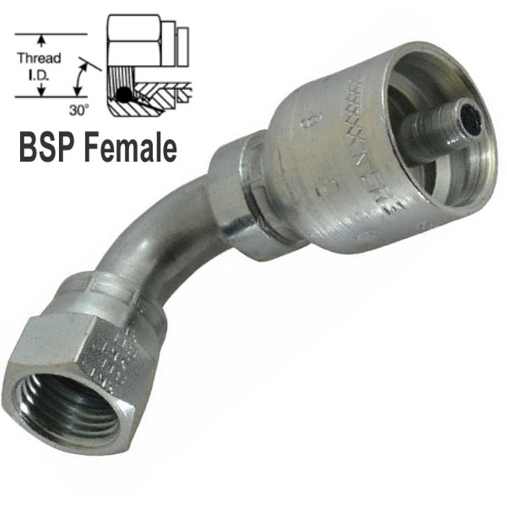 Hydraulic Crimp Hose End. Female BSPP tube elbow 90 Degree swivel with 60 Degree cone, one to 43 Series Parkrimp fittings. Use with 100R1AT, 100R2AT, 100R16, 100R19, 100R17,EN857-2SC,100R103