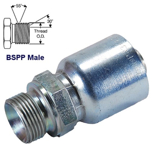 Hydraulic Crimp hose end. Male BSPP rigid 60 Degree cone , one piece. Use with 100R1AT, 100R2AT, 100R16, 100R19, 100R17,EN857-2SC,100R12