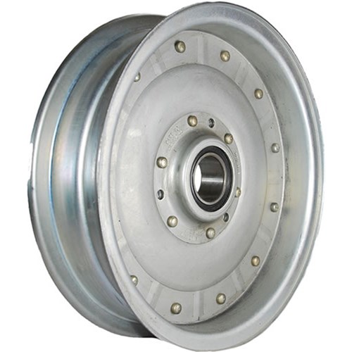 Don Dye pressed steel pulleys are designed to make a complete, economical, self contained unit for either flat or "V" side of belt. They are furnished with a single-row, radial-type, highest quality precision ground, pre-lubricated ball bearing (made of 52100 bearing steel) with contact-type seals to insure positive retention of lubricant and full protection against dirt, dust or foreign matter. These bearings contain a 60% fill of high temperature grease, no re-lubrication required.