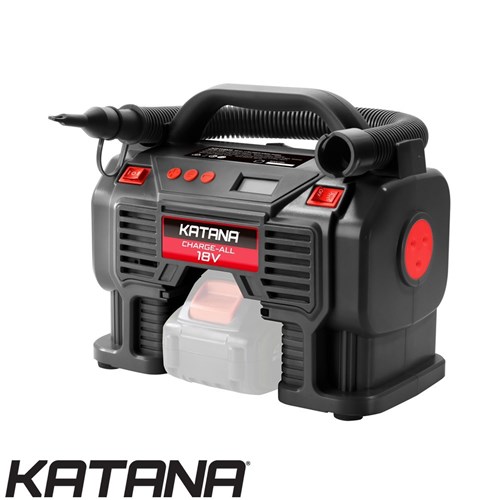 The Katana 18V Charge-All Hybrid Inflator Station is your all in one go-to for inflating anything from car and motorcycle tyres, sporting equipment, Bicycle tyres, air mattresses, inflatable toys and sports equipment.