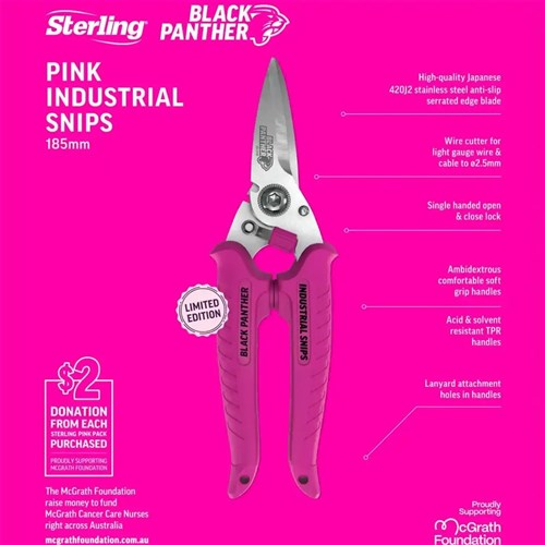 The Sterling 29-721P is a heavy-duty 185mm industrial snip built for electricians, tradies, and installers who demand reliable cutting performance on-site. Featuring precision-ground Japanese 420J2 stainless steel blades with a serrated edge, it delivers sharp, controlled cuts every time. Designed for tough daily use, it includes a built-in wire cutter, soft TPR handles, and a one-handed locking mechanism for safe storage. With ambidextrous comfort and pro-grade durability, these snips are ready for any job. Every pink product sold also contributes $2 to the McGrath Foundation, helping fund specialist breast care nurses who support families facing breast cancer across Australia.
