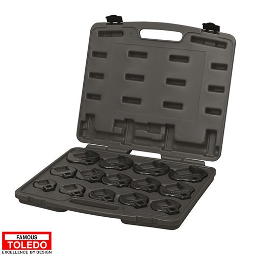 This 14-piece Toledo Crowfoot Wrench Set is designed for professional use in confined or hard-to-reach areas where standard spanners and sockets fall short. Featuring straight jaws and a 1/2” square drive, each piece delivers reliable torque and secure fitment on fasteners. Built for durability and convenience, the set is housed in a sturdy blow-moulded storage case for easy transport and organisation.