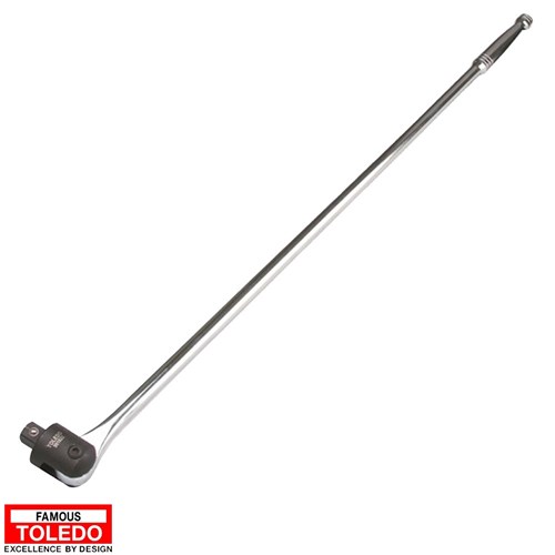 The Toledo Standard Head Breaker Bar 3/4” Square Drive 1000mm is manufactured for corrosion resistance from heat treated, drop forged chrome vanadium steel in a chrome mirror finish. The square drive design allows for a rotation of 180 degrees, while a heavy duty, thick neck robust bar allows for tough applications.