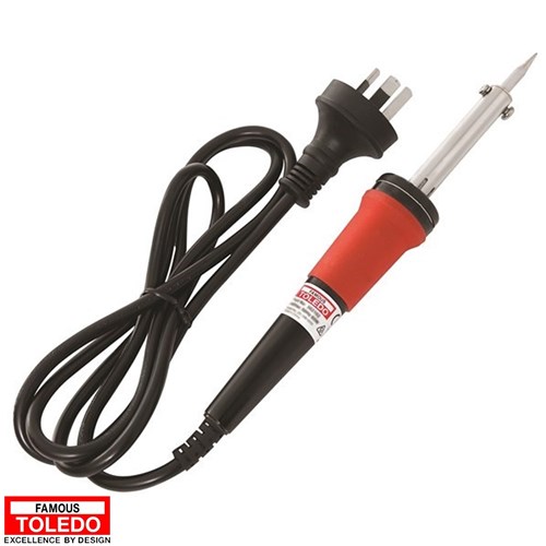 The Toledo 240V Soldering Iron is a reliable, easy-to-use tool ideal for light-duty soldering tasks. With a power output of 25W and a heat range of 390–420°C, it delivers consistent performance for electrical and electronics work. Featuring a comfortable, heat-resistant bakelite handle with a rubber grip, this soldering iron ensures user safety and control. Its nichrome element and long-life tip offer durability, while the included metal stand provides a safe, bench-mountable storage solution. Fully SAA approved, it's safe and legal for use across Australia.