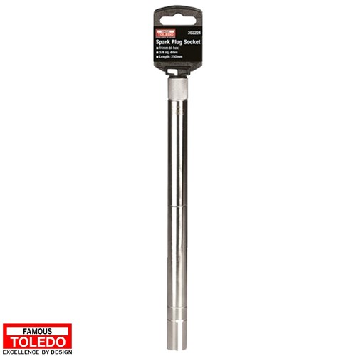 The Toledo Spark Plug Socket 14mm is designed in an extra-long shape for the easy removal and installation of spark plugs. The tool is crafted from satin chrome vanadium steel and features a knurled barrel for non-slip grip, spark plug retainer and a 3/8” drive.