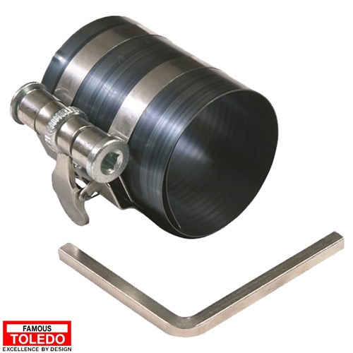 The Toledo Small Piston Ring Compressor is designed for use during the installation of rings into the engine cylinders. Featuring self-locking ratchet assembly, wide band design, spring steel band and an adjustable bore diameter.