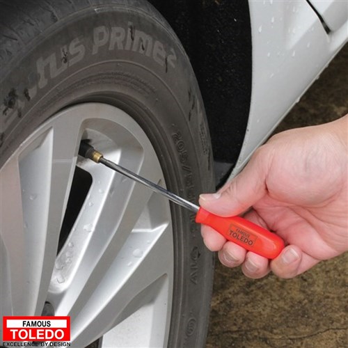 The Toledo Tyre Valve Remover Set is a handy two-piece kit designed for quick and easy removal and installation of tyre valve cores. Featuring moulded plastic handles for a secure, comfortable grip, this set includes both a regular reach tool (110mm) for passenger vehicles and motorcycles, and a long reach tool (155mm) ideal for trucks. A must-have for tyre service professionals and home mechanics alike.