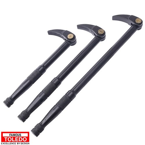 The Toledo Rolled Head Pry Bar Set – Adjustable 3 piece features high leverage pry bars which feature a curved head. The 180 degrees adjustable heads are ideal for use in hard-to-reach areas. A pushing lock, knurled handle and a black phosphate finish have been included for the ultimate tool.
