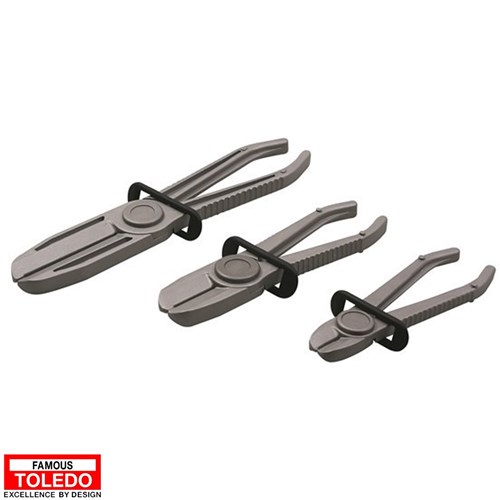 The Toledo 3 Piece Brake Fuel Line Clamp Set is designed to restrict flow during use of fuel hose, brake lines and coolant lines. The tool features high quality aluminium, damage free crimping jaws and a serrated lock ring.