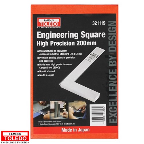 The Toledo engineering square is created from premium quality Japanese Carbon Steel and is suitable for automotive, industrial, metalwork, woodwork and engineering applications. The tool can also be used for measuring straight lines and right angles. Length: 200mm.