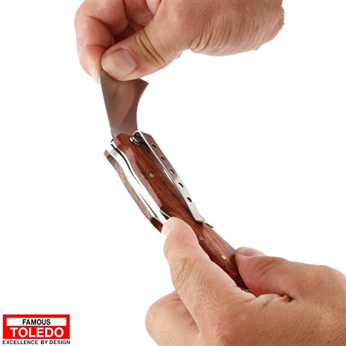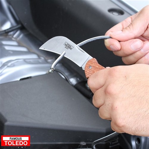 The Toledo Technician’s Knife with a hawkbill blade is the perfect tool for precise slicing and cutting tasks. Crafted from heavy-duty stainless steel, it handles wire insulators, cables, rope, rubber mats, and more with ease. The premium rosewood ergonomic handle offers comfort and durability, complete with brass fastenings, a tethering anchor point, and a sturdy pocket clip for secure carry. Its folding design ensures portability and safety on the job.