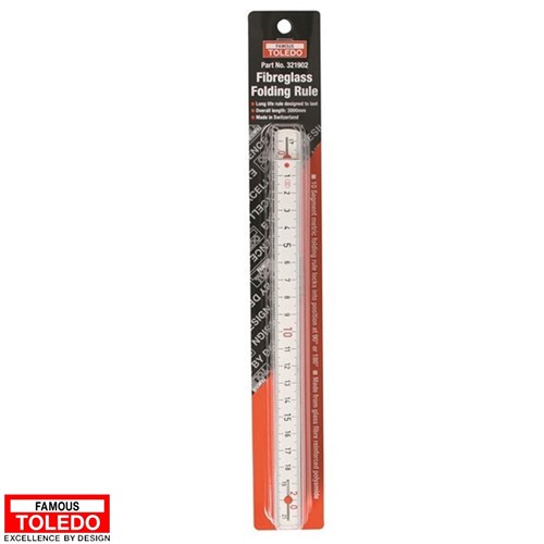 The Toledo Double Sided Folding Rule Fibreglass Metric 2000mm features graduations in millimetres on lower and upper edges. The double-sided markings are ideal for electrical and trade work. Overall length: 200mm