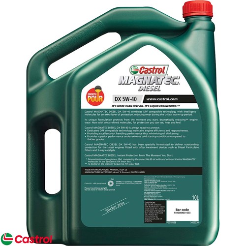 Castrol Magnatec Diesel DX 5W-40 is a synthetic engine oil suitable for use in automotive gasoline and diesel engines where the manufacturer recommends an ACEA C3, API SN/CF or earlier specification 5W-40 lubricant.