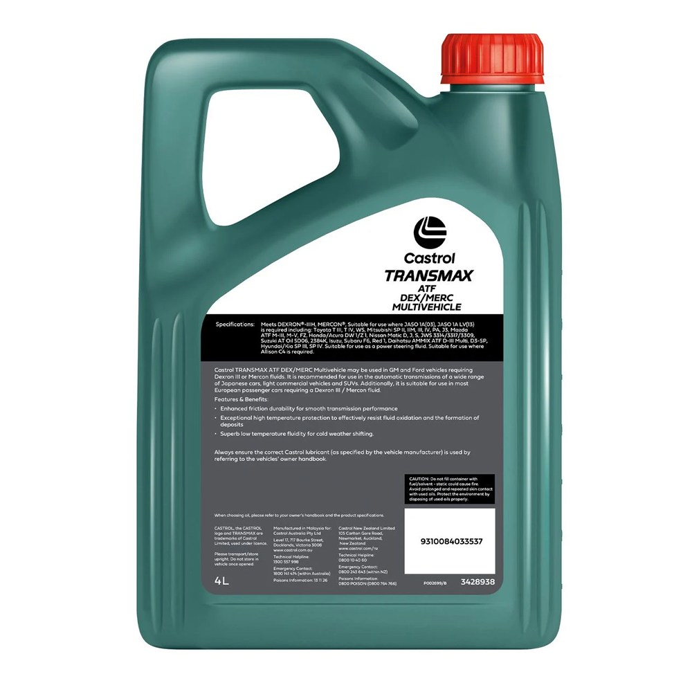 Castrol Transmax ATF Dex/Merc Multivehicle is recommended for use in GM and Ford vehicles requiring Dexron III orMercon fluids and the automatic transmissions of a wide range of Japanese cars, light commercial vehicles and SUVs. Additionally, it is suitable for use in most European passenger Cars requiring a Dexron III/Mercon fluid. Suitable for use where JASO 1A(03)JASO 1A LV(13) is required including:Toyota T III, T IV, WSMitsubishi SP II, IIM, III, IV, PA, J3Mazda ATF M-III, M-V, FZHonda/Acura DW 1/Z 1Nissan Matic D, J, SJWS 3314/3317/ 3309Suzuki AT Oil 5D06, 2384KIsuzuSubaru F6Red 1Daihatsu AMMIX ATF D-III Multi, D3-SPHyundai/Kia SP III, SP IVSuitable for use as Power steering fluid
