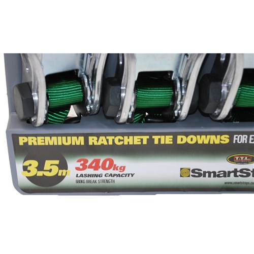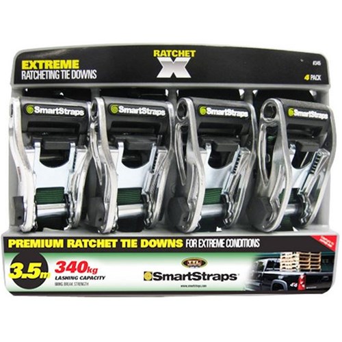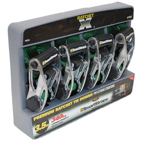 Smart Strap RatchetX tie down strap. 25mm x 3.5m size four pack with 340Kg lashing capacity. Features super-strong webbing and a nice padded grip for ease of use.Conforms to Australian Standards.
