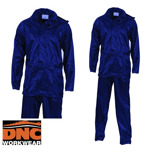DNC Navy Rain Set supplied in bag. Waterproof, two flap side pockets, foldaway hood. 3/4 Length Jacket & elastic side pants with leg press stud closure.
