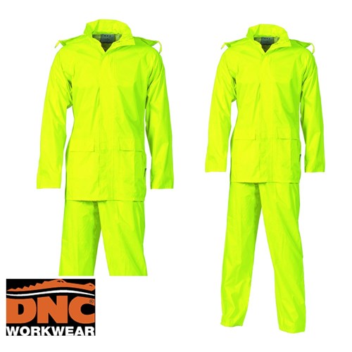 DNC Yellow Rain Set supplied in bag.This Material does not comply with AUS /NZ HiVis Standard. Waterproof, two flap side pockets, foldaway hood. 3/4 Length Jacket & elastic side pants with leg press stud closure.