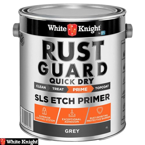 white knight SLS etch primer is an etching primer designed to bite into hard to paint steel surfaces to allow for superior adhesion for top coats. Ideal for priming aluminium, galvanised iron ZINCALUME®, chrome, brass and copper objects to protect from corrosion. light grey in colour.