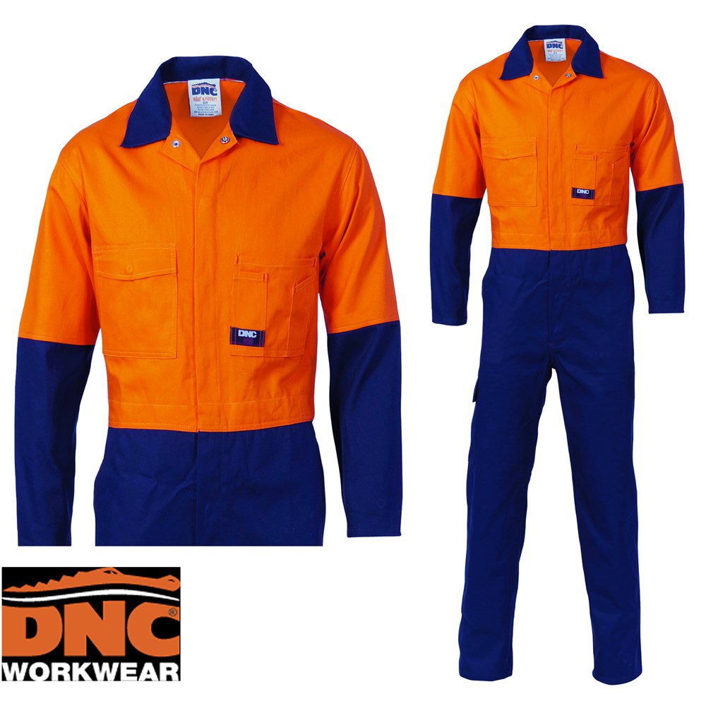DNC Hi Visability Orange / Navy two tone cotton coverall. Features 311gsm 100% heavy cotton drill fabric. Gusset sleeve, flap cargo pocket on lower leg and metal press studs.