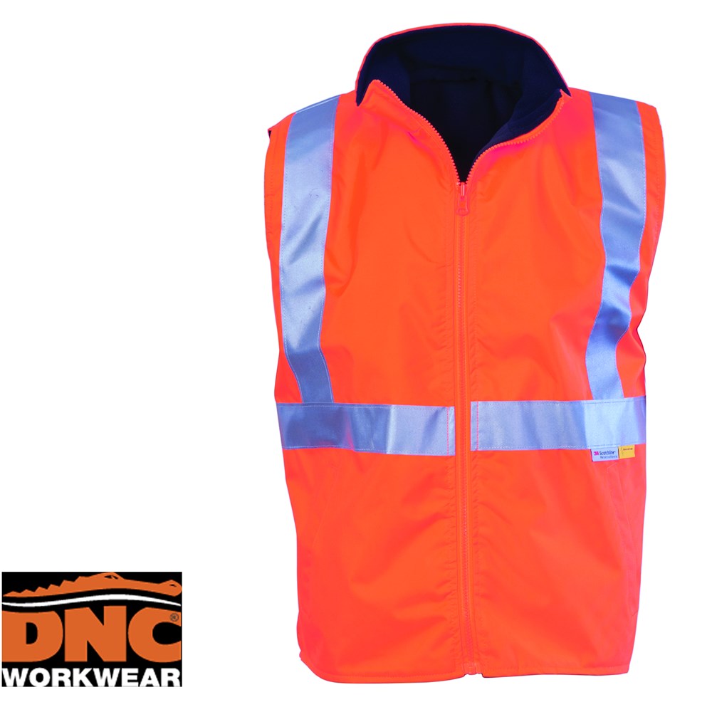 DNC Hi Visability Orange / Navy reversible vest with 3M reflective tape. Features breathable polyester shell, two side pockets. Reversible polar inner fleece with access for embroidery.